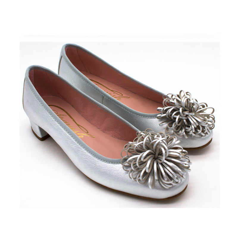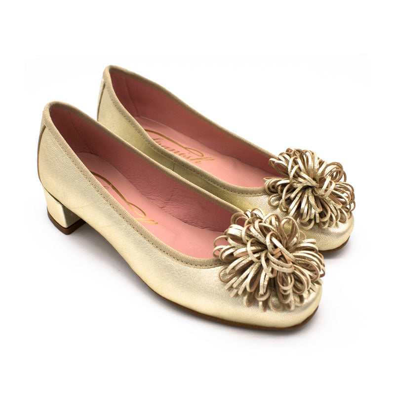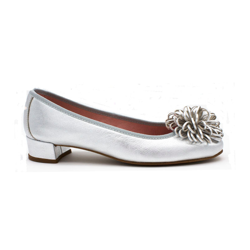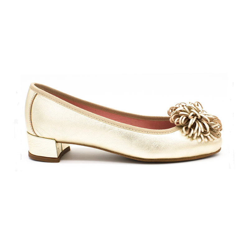 Bailarina de piel metalizada, pompon de piel metal y tacón de 3 cm, forro y plantilla de piel rosa