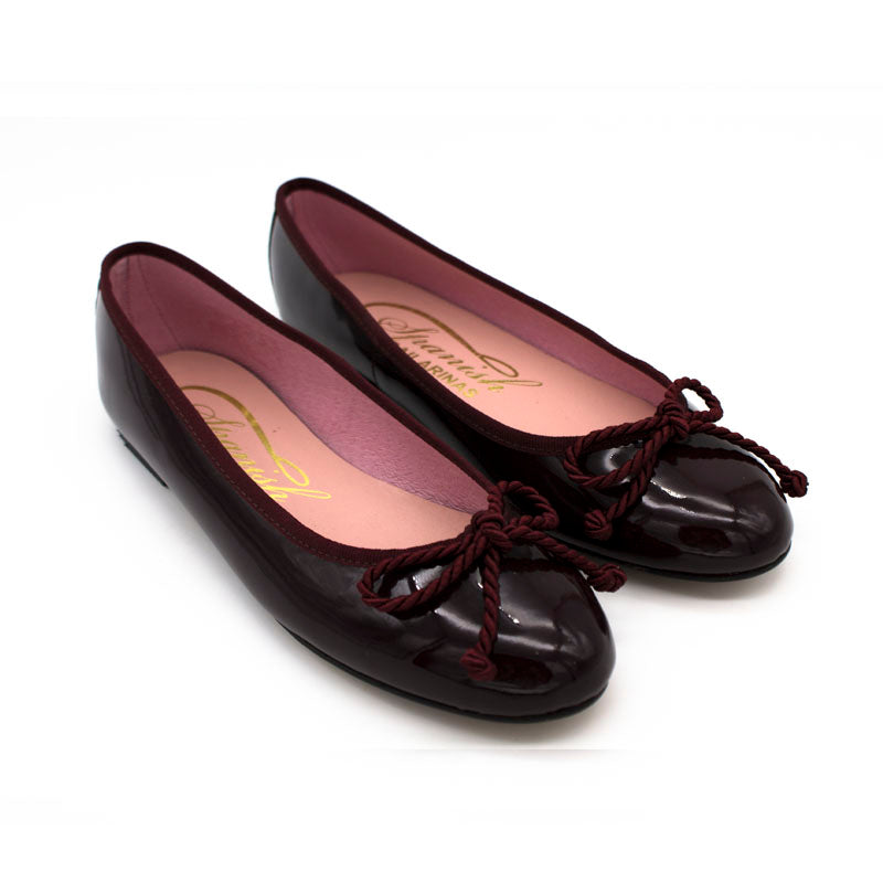 Bailarina plana de piel charol con lazo grueso, forro y plantilla de piel rosa.