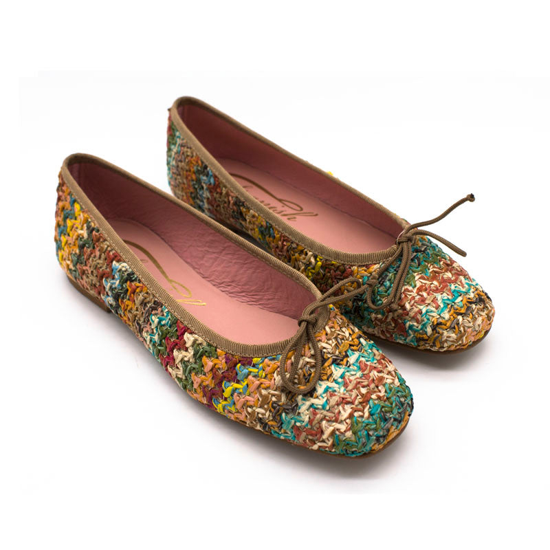 Bailarina plana de rafia, cordón ajustable, forro y plantilla de piel rosa, puntera cuadrada.