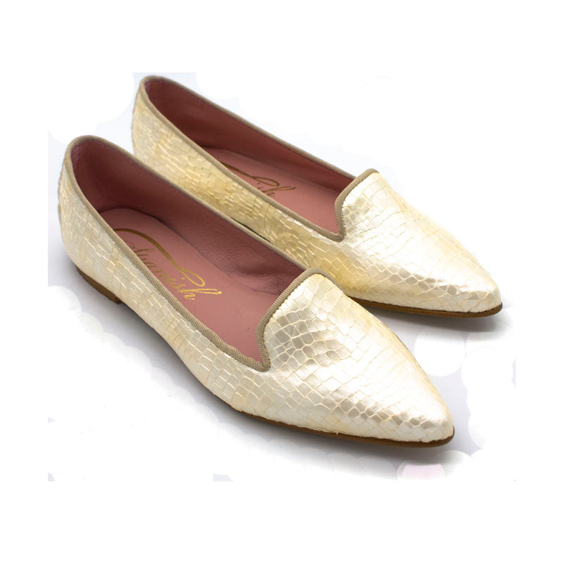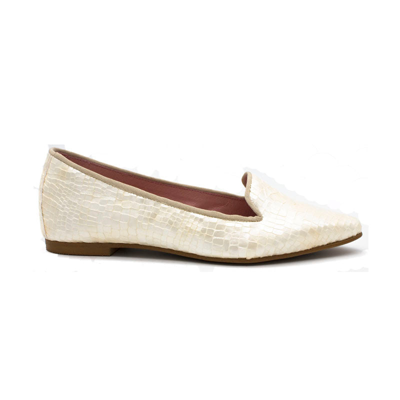 Bailarina con tacón de 1,5 cm, piel de charol con grabado, pala alta, forro y plantilla de piel rosa.